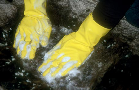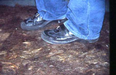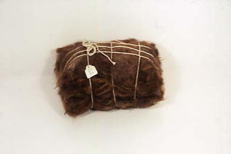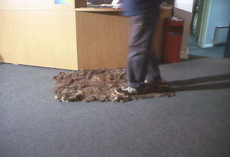 A series of photographs shows the artist felting human hair into a rug. This rug was then placed in front of the gallery’s reception desk were visitors had to walk on it. The rug remained in place for four week. By the end of this period it had all but disintegrated. The remains where collected, bundled up with string, labelled and archived.
