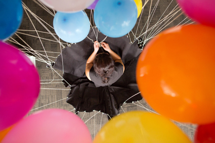 For this durational work the artist sits on the floor, wearing a long, elegant, black dress. In the beginning the dress is spread out in a circle around the artist as she is holding a big bunch of colourful helium balloons. Audience members come up to her, take a balloon out of her hand and attached it to the hem of her dress, slowly causing it to lift, until Lakmaier's face is obscured and her legs and underwear are exposed.