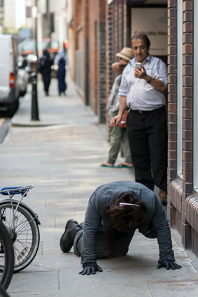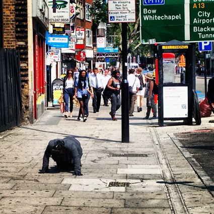 On the 28th of May 2012 Noƫmi Lakmaier set out from Toynbee Studios in Tower Hamlets, one of London's most deprived Boroughs towards the City of London, the beating heart of banking and capitalism. She hoped to reach one of London's most iconic buildings the 'Gherkin'. This normally easy, one-mile stroll was a slow and exhausting test of endurance, as she did it on her hands and knees; an exercise in socio-geographic mapping. Smartly dressed in business attire she crawled through the street life of London, her clothes getting increasingly dirty and torn. After 7 hours she crossed the border from the Borough of Tower Hamlets to the City of London.