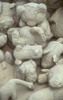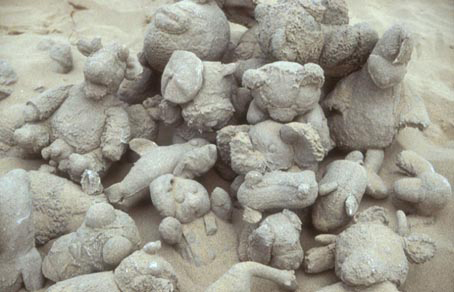 Milestones consists of a variable number of second hand soft-toys. The toys are covered in glue and sand from a beach on the north-east Italian coast. The sand transforms the soft, fluffy toys into hard, solid objects. Milestones appears in public paces, allows the public to interact with the objects and then disappears again. This is an ongoing project. So far it has been seen in Bibione Pineda / Italy in 2001 and Winchester / Hampshire in 2004.