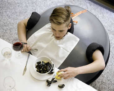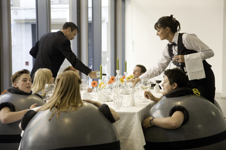 This living installation invites the public to take on the role of voyeur, and observe an elaborately staged dinner party. Eight preselected volunteer diners participate in this public gesture, while seated/contained in human-sized weebles ("weebles, wobble, but they don't fall down...") The piece combines both elements of the uncanny and absurd, as a normally private dinner party becomes the object of the public gaze.