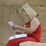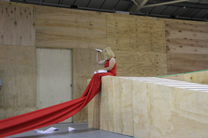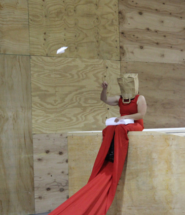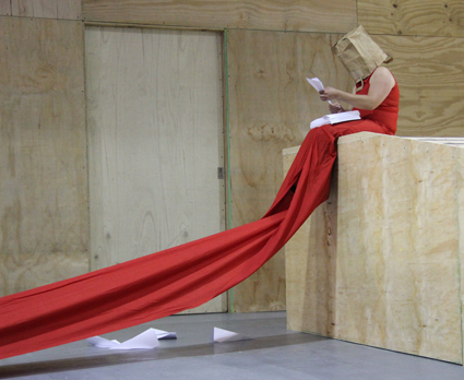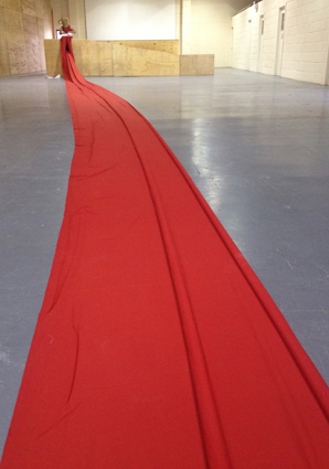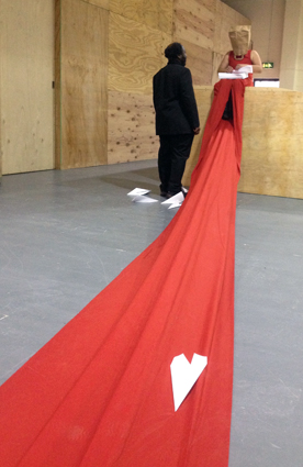In this work Lakmaier sits on a wooden stage, wearing a brown paper bag over her head and an 80-meter long red dress that stretches though the gallery space and out into the car park, inviting visitors to walk on it like on a red carpet. As viewers come closer they see the artist with a ream of paper in her lap, slowly and methodically folding paper airplanes and launching them into the gallery space. At a time unknown to the artist, she is picked up by a man in a suit who carries her out of the building, dress trailing behind them.